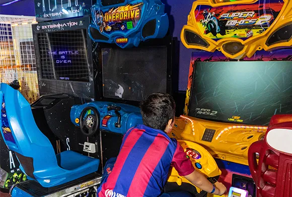 área de games com máquinas importadas e diversas opções para entreter crianças e adultos